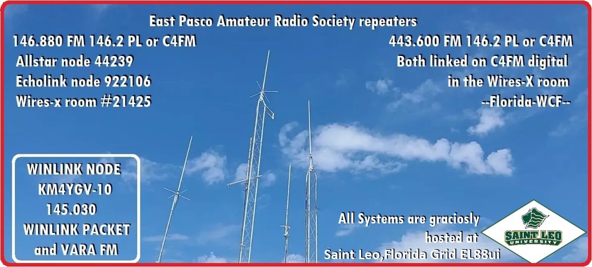 Copyright© 2012-2023 East Pasco Amateur Radio Society, INC. All Rights Reserved. Web Page design by Chris AA4CB webmaster@eparsonline.orgTheme by SiteOrigin